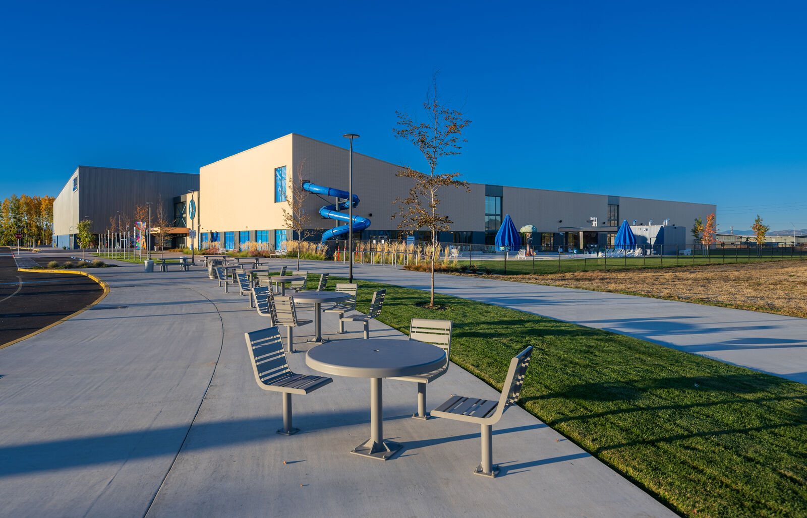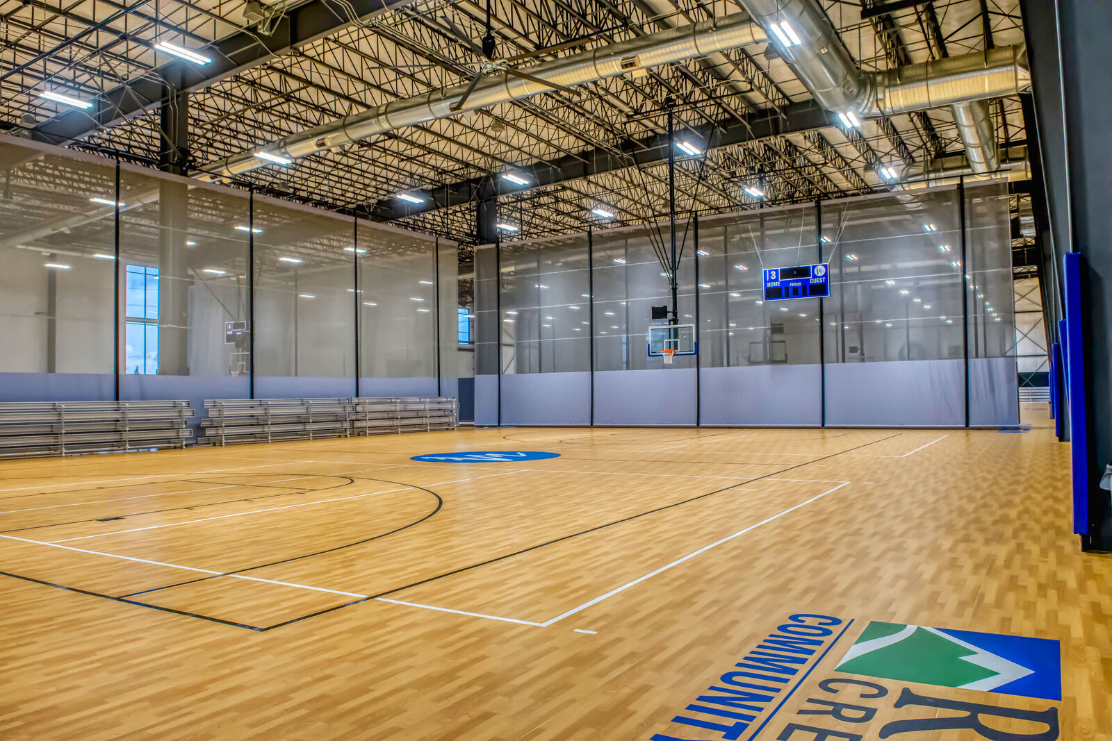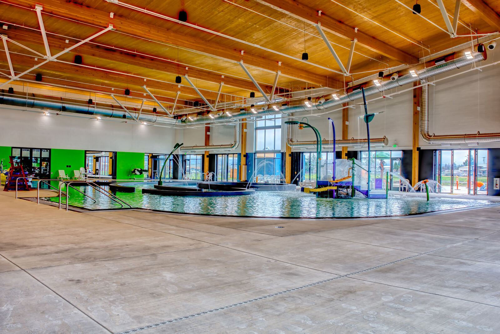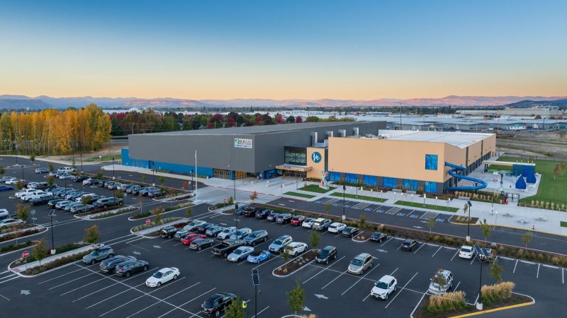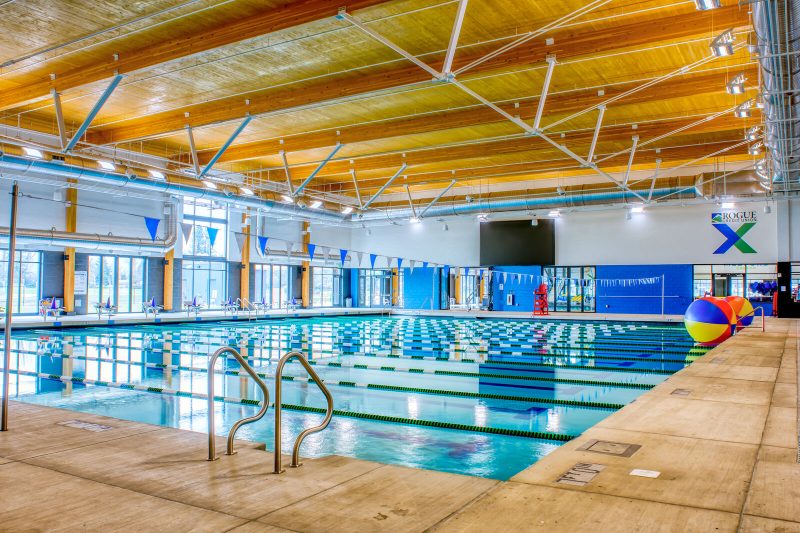 This 140,000 SF recreational facility features a natatorium, a sports complex that doubles as an event center and athletic classrooms. The aquatics facility has indoor recreational and competition pools, two waterslides, an outdoor splashpad play area and more. The pool room’s unique roof is comprised of cross-laminated timber, 105-foot glulam beams and bow-string trusses. The 76,000 SF multiuse building includes eight indoor basketball courts that can be converted to 16 volleyball courts or 32 pickleball courts. The space can also be utilized for full- or partial-room events by pulling the divider curtains across to create smaller sections. The two main buildings are connected via a central corridor containing bathrooms, locker rooms, offices, a dance studio and more. Several challenges were encountered early on, including issues with the site’s soil. But Pence’s project team collaborated with the structural engineer and subcontractors to identify and implement solutions, such as adding aggregate piers to stabilize the foundation. The Rogue Credit Union Community Complex (RCUCC), or “Rogue X” as the community calls it, is the city of Medford’s largest building project in history.
